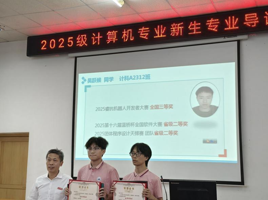 专业导读教育活动中,院长邓安远、党委书记邹国辉、副院长董西伟为2025年学科竞赛成绩优异的学生颁奖。颁奖仪式让整个专业导读活动从“被动听讲”变为“主动向往”,它用最直观的方式回答了新生心中最迷茫的问题:“我的大学应该怎么过?我的专业未来能做什么?”这为他们的大学生涯树立了学习榜样。