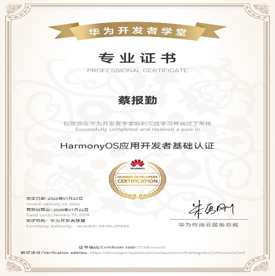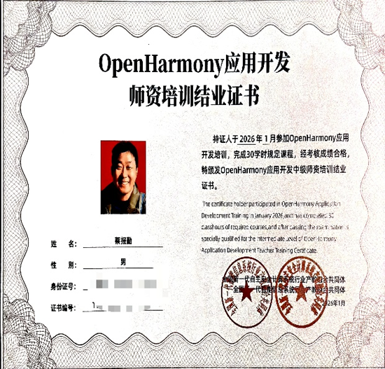为深入推进开源鸿蒙技术在高校教育领域的落地与普及,切实提升高校教师的技术应用能力和教学实践水平,2026 年 1 月 21 日至 23 日,由开放原子开源基金会主导的 “2026 开放原子校源行师资培训(湖南站)暨全国开源鸿蒙技术应用开发寒假师资培训” 在湖南信息职业技术学院顺利举办。beat365正版唯一官网必一蔡报勤老师受邀参加本次专项培训,顺利通过考核并取得华为相关技术认证。