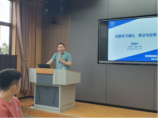 5月16日,景德镇陶瓷大学信息工程学院院长贾建华教授应邀访问学院,并在学校电子信息实验楼602学术研讨室做了题为《深度学习理论、算法与应用》的精彩学术报告,计算机学院院长邓安远、副院长彭虎、师生代表聆听报告。