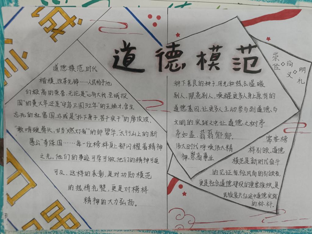 活动中,同学们积极参与,用自己的智慧和巧手创作出一张张精美的手抄报,通过在收集相关资料和制作手抄报的过程进一步加强了对道德模范相关事迹的认识与学习。许多作品不仅图文并茂,而且书写美观,标题醒目突出,内容也十分生动,他们用最真实的情感,充分展示了向道德模范学习的积极性。