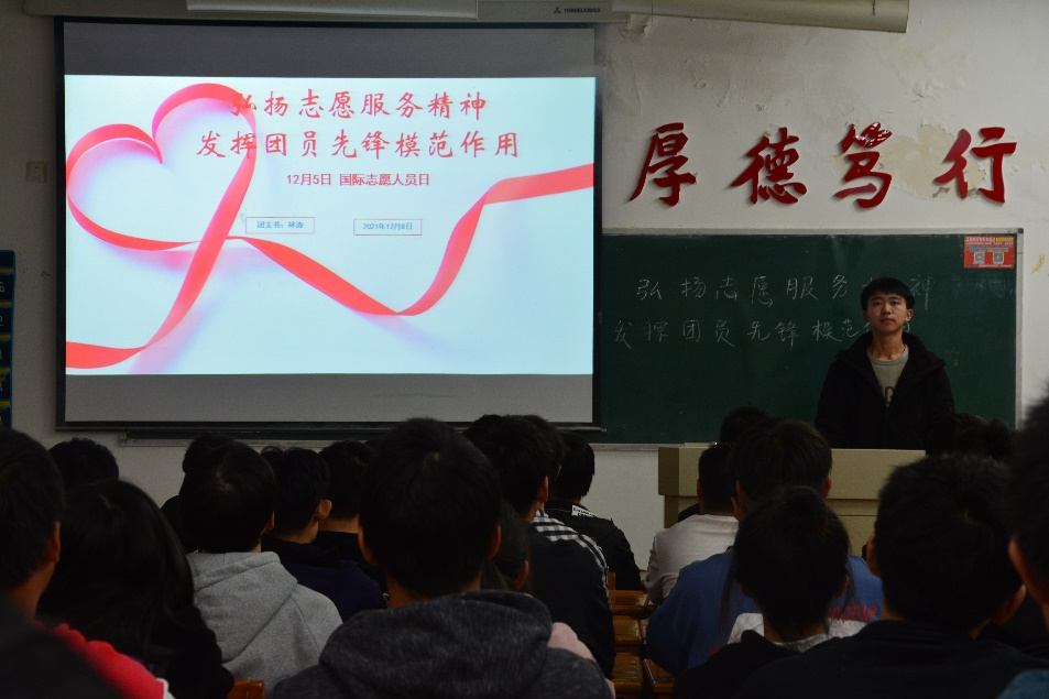 为弘扬志愿精神,传递公益能量。12月8日晚,计算机学院于文友楼各班教室开展“弘扬志愿服务精神,发挥团员先锋模范作用”主题团日活动,此次活动由各班团支书主持,全体大一学生参加。