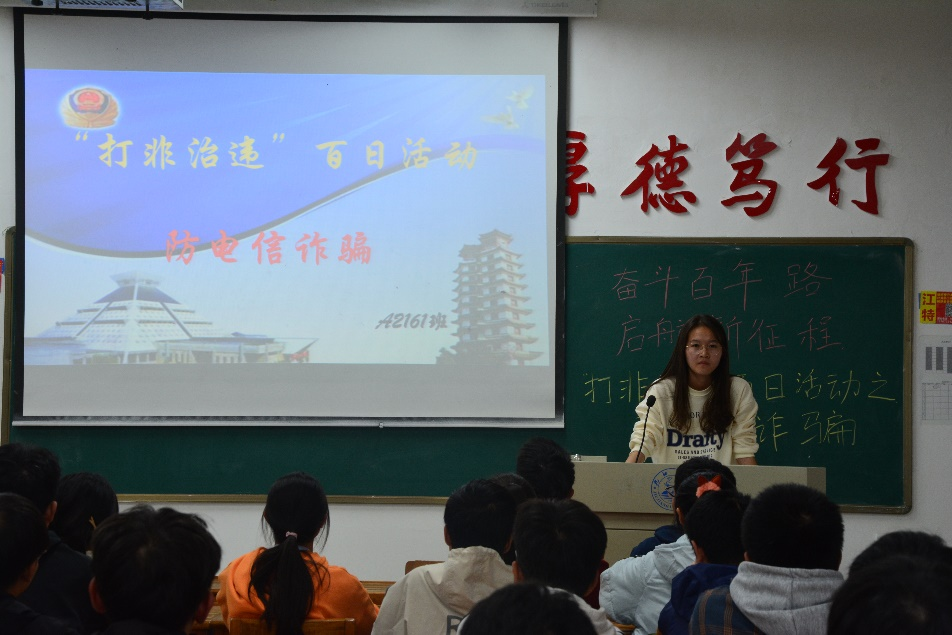 为推动学校安全专项整治三年行动走深走实,防范校园诈骗事故发生,11月17日晚,计算机学院于文友楼各班教室开展“‘打非治违’百日活动之防电信诈骗”主题团日活动,此次活动由各班团支书主持,全体大一学生参加。