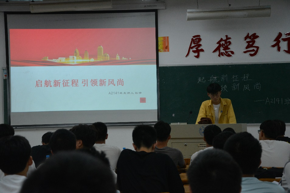 活动采用ppt与视频结合的方式,以“课堂如何收心”作为切入点,从养成良好的学习生活习惯到制订树立正确的目标展开,以当代大学生两种截然不同的学习、生活方式,一种是积极参加各项活动认真学习,另一种则是消极怠工熬夜打游戏形成对比,引导同学们思考该如何度过有意义的大学时光。各班军训负责人呼吁大家首先要树立“我能行”的信心,接着要有持之以恒一步一脚印的耐心,之后要有一丝不苟的专心,最重要的是要坚定不移的决心。