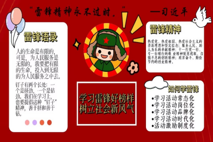 为弘扬雷锋精神,引导同学们树立牢固的热爱党、热爱祖国、热爱人民的坚定信念,计算机学院团委宣传部于2月28日举办了“向雷锋学习,树社会新风”电子板报征集活动。