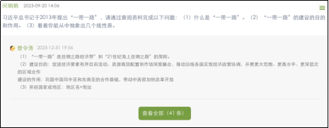 播放“秒懂一带一路”视频,以“一带一路”作为线性表的典型案例之一,结合学生课前自学掌握的相关信息,布置成分组任务,引导学生从地域、国家、城市等不同层次抽象出多个线性表,进一步加深学生对线性表特点的理解。 |