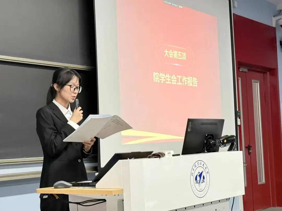 刁默涵代表学院学生会作工作报告。她全面回顾了过去一年学生会在思想引领、校园文化建设、服务同学等方面取得的可喜成绩,并指出未来学生会要立足学院独特文化底蕴,以更高的标准、更实的举措开拓创新、勇毅前行,为学院的发展贡献更多力量。