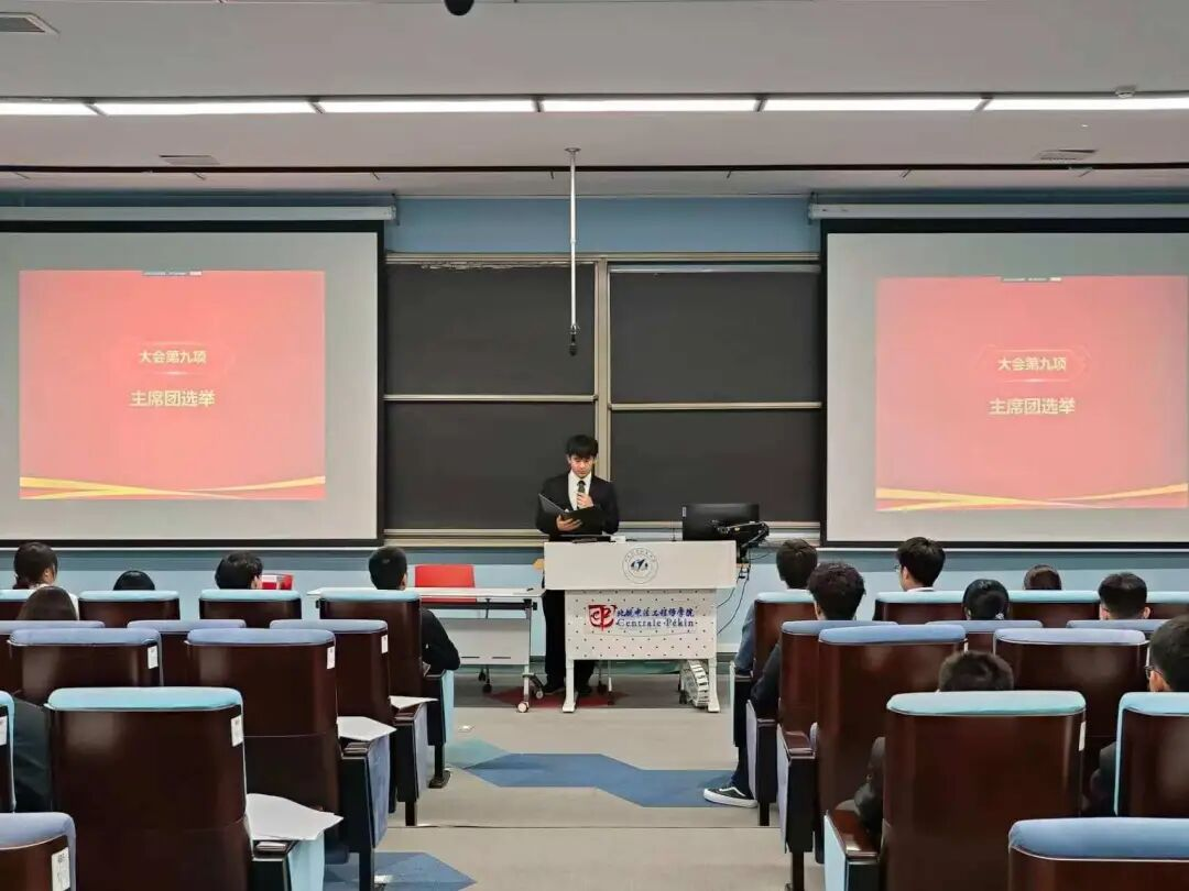 随后,大会进行选举环节。主持人宣读了中法/国通学院第四次学生代表大会监票、计票人员名单与主席团选举办法。各位候选人依次上台进行个人陈述。